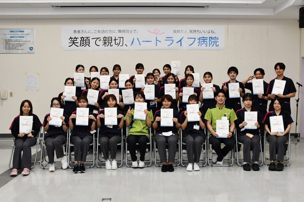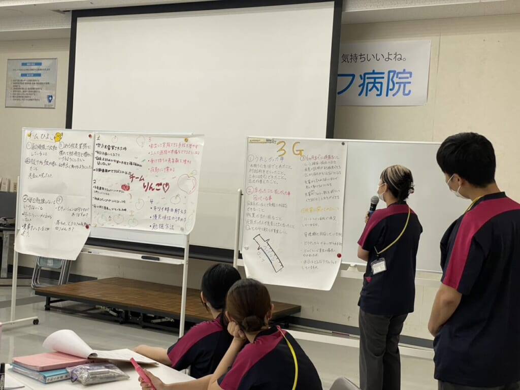 この1年の歩みを振り返り、次のステージに向けた目標を立てる研修に加え、同期とともに修了を祝うセレモニーも行われます。一人ひとりの成長を確認し、今後の看護師人生の土台を固める機会です。