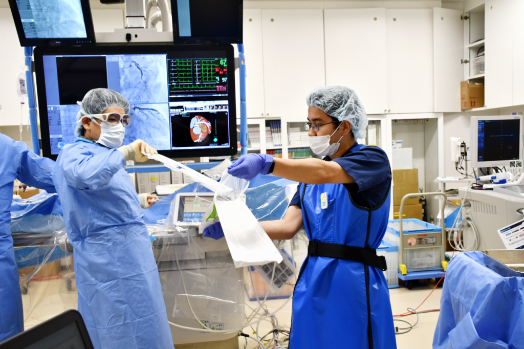 心臓カテーテル治療では、ポリグラフや血管内超音波(IVUS)の操作を通じて安全な治療をサポート。ペースメーカー植込み手術や外来での定期チェックにも携わり、患者さん一人ひとりに最適な設定を追求します。
