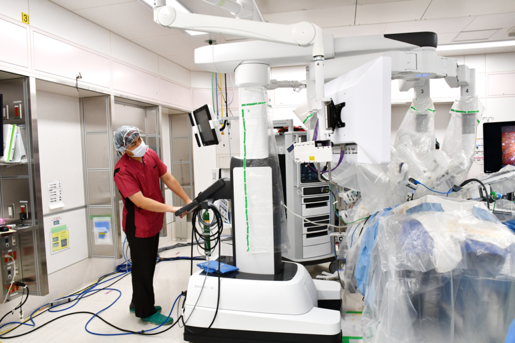 全身麻酔器や内視鏡システムの保守点検で手術中のトラブルを最小限にすることで手術室の安定的な運営に尽力しています。それに加え、手術支援ロボット「da Vinci(ダビンチ)」ではチームの一員として参加します。また、多くの診療科で清潔野での器械出しも担当します。機器への深い知識と清潔操作の技術を融合させ、機器トラブル時には迅速に対応し、手術のスムーズな進行に貢献します。
